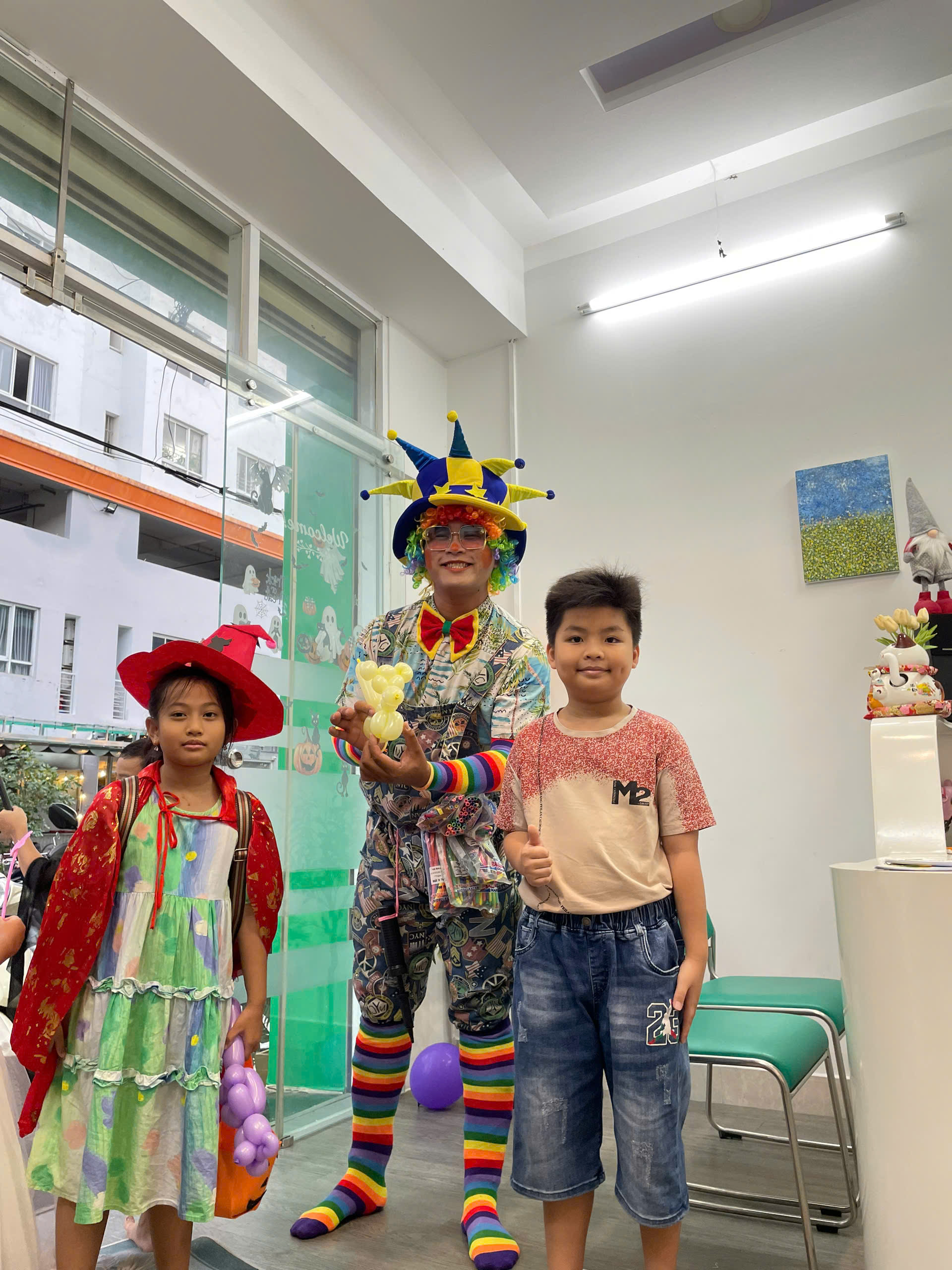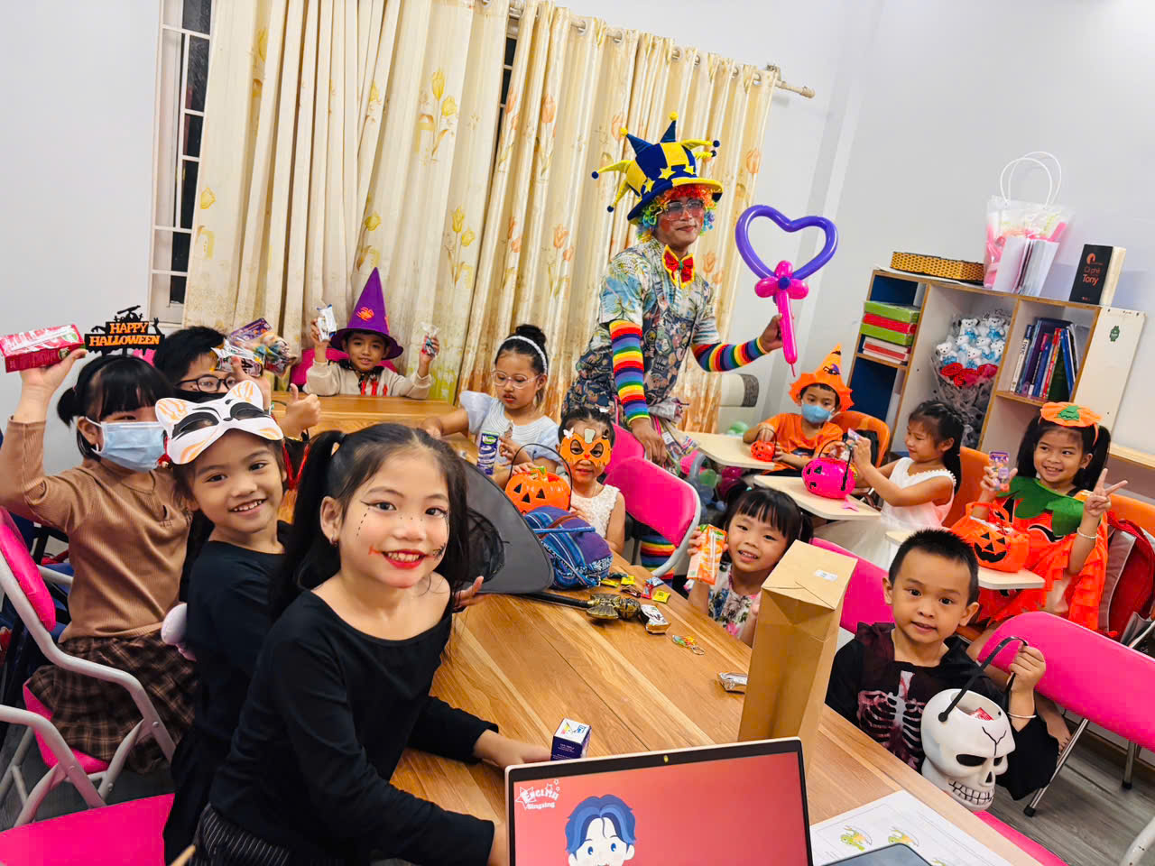 Ngay từ khi bước vào trung tâm, các bạn nhỏ đã vô cùng thích thú với không gian được trang trí theo chủ đề Halloween - Điểm nhấn của buổi tiệc chính là sự xuất hiện của chú hề vui nhộn, người đã mang đến vô vàn tiếng cười cho các bạn học viên với những màn biểu diễn hài hước, bong bóng nghệ thuật độc đáo và phần phát kẹo đầy bất ngờ.