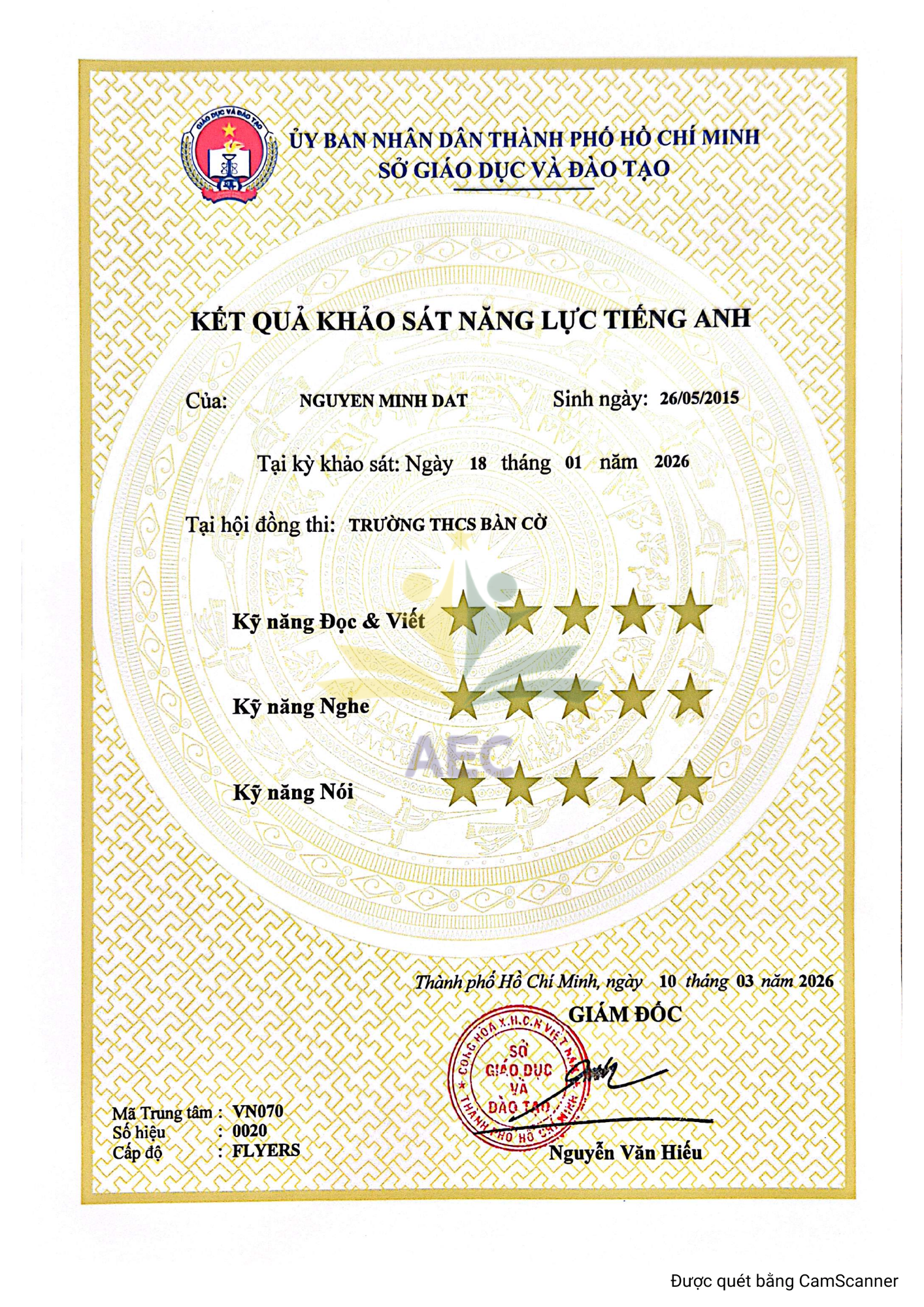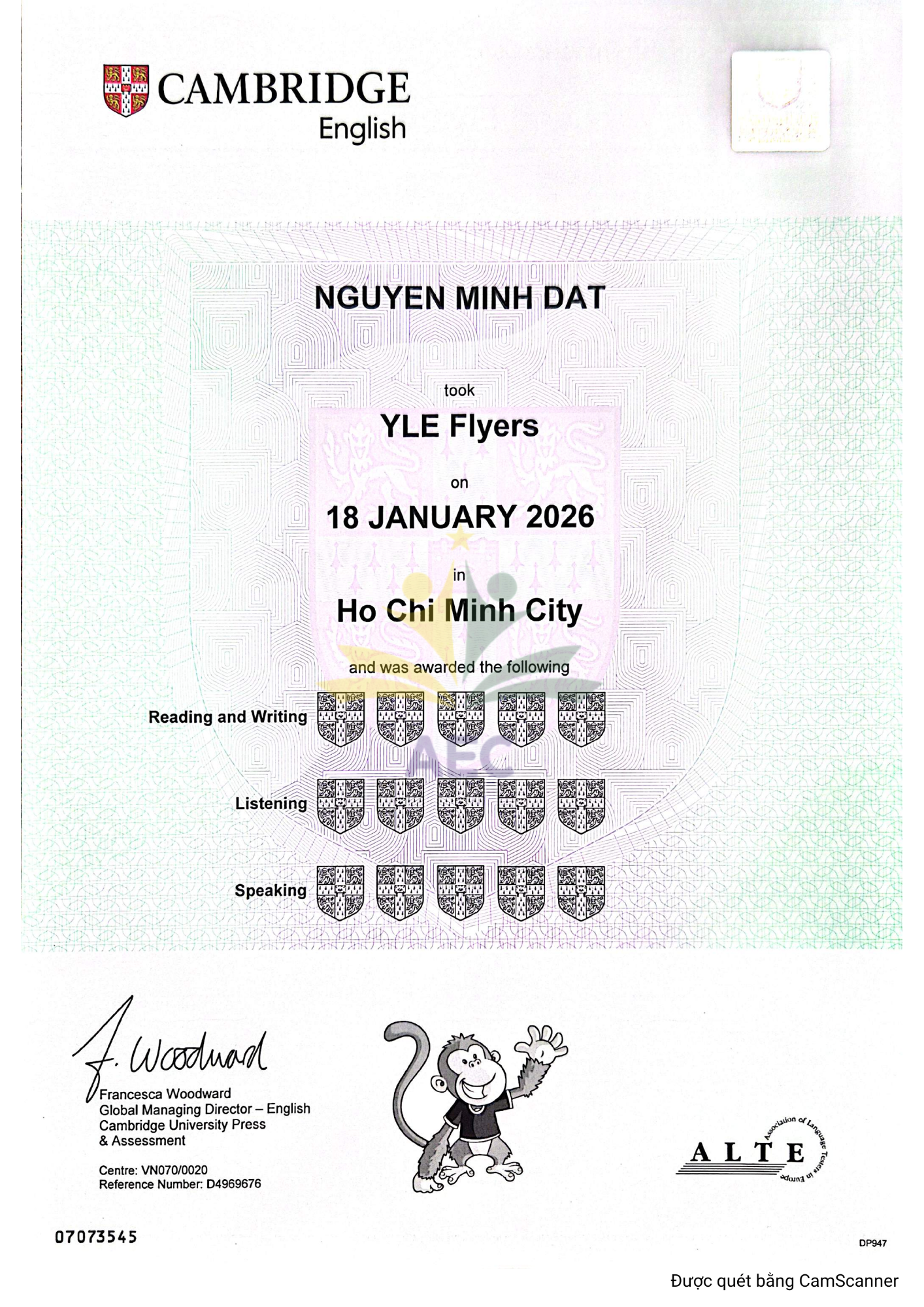 Đây là một kết quả hoàn hảo ở cấp độ Flyers (A2) – cho thấy Đạt đã có nền tảng tiếng Anh rất vững chắc và khả năng sử dụng ngôn ngữ một cách tự tin, toàn diện ở cả 3 kỹ năng.