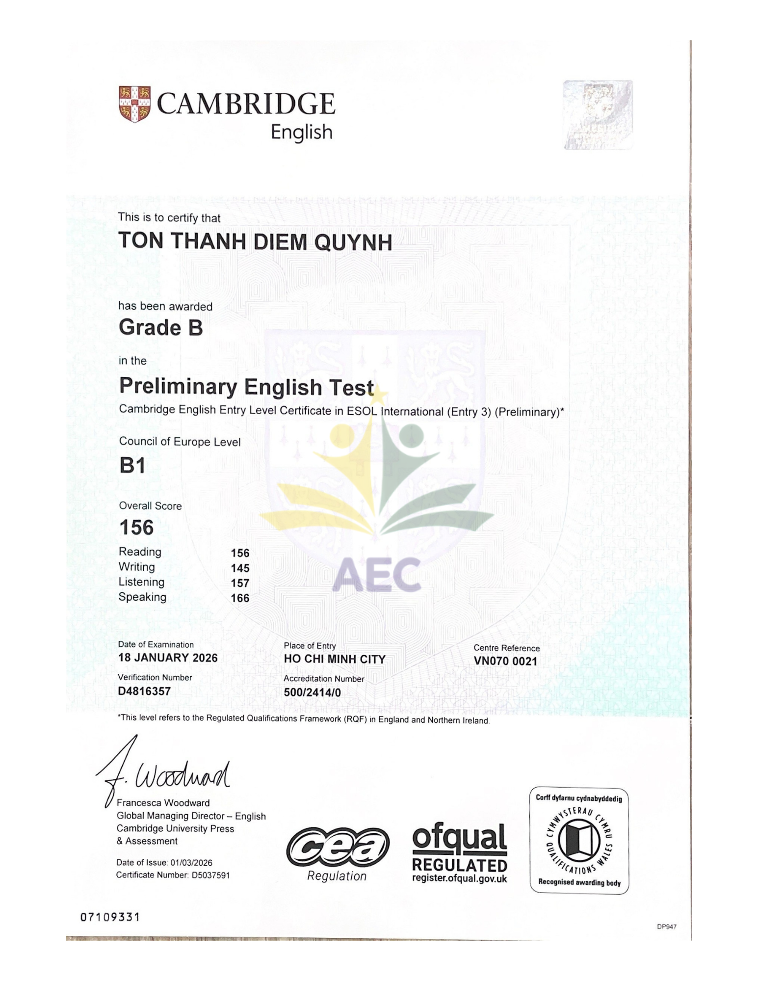 Trung tâm Ngoại ngữ An xin chúc mừng bạn Tôn Thanh Diễm Quỳnh đã xuất sắc đạt được chứng chỉ PET B1 với kết quả vô cùng ấn tượng!